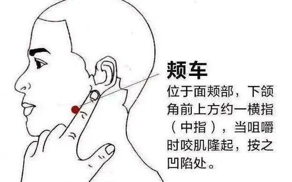 1.取穴颊车穴(如图),在面部,当下颌角前下方一横指凹陷中;经验取穴,使患者用力咬牙,在咬肌隆起处取穴,属胃经穴,此处下方为颜面重要咀嚼肌咬肌,分布有面神经、耳大神经、咬肌动静脉。