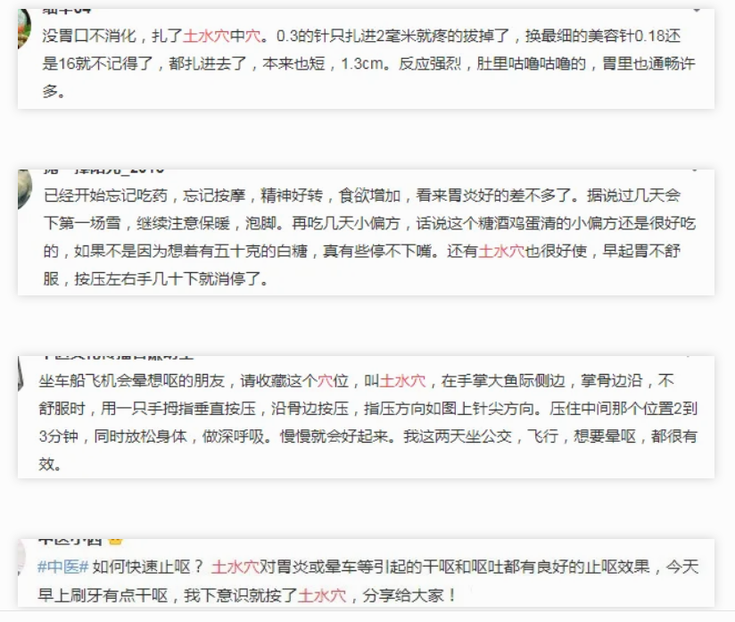 对于晕车、水土不服、上吐下泻的症状及胃酸过多刺激土水穴都非常有效。尤其对于胃酸、胃胀等胃部不适,基本针下痛止。